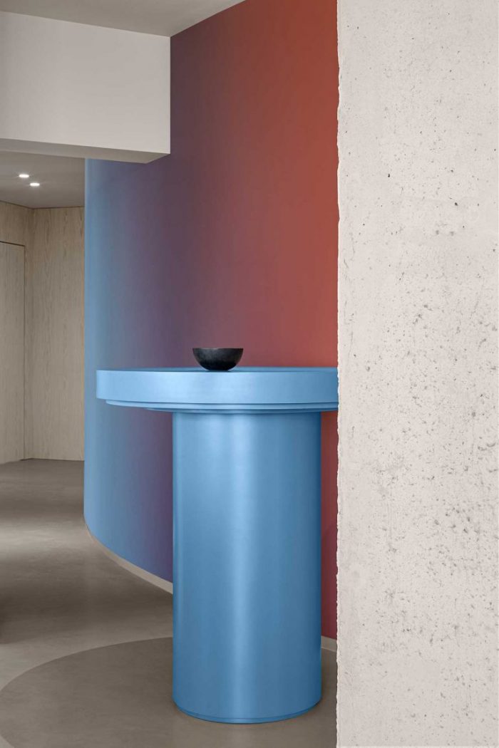 A micro cement floor grounds each space with warm beige covering most of the walls. A wall along the curved hallway features a bold gradient that transitions from terracotta to sky blue. The kitchen continues the use of terracotta with custom cabinets and an island covered with terracotta Mutina tiles in a variety of warm shades.