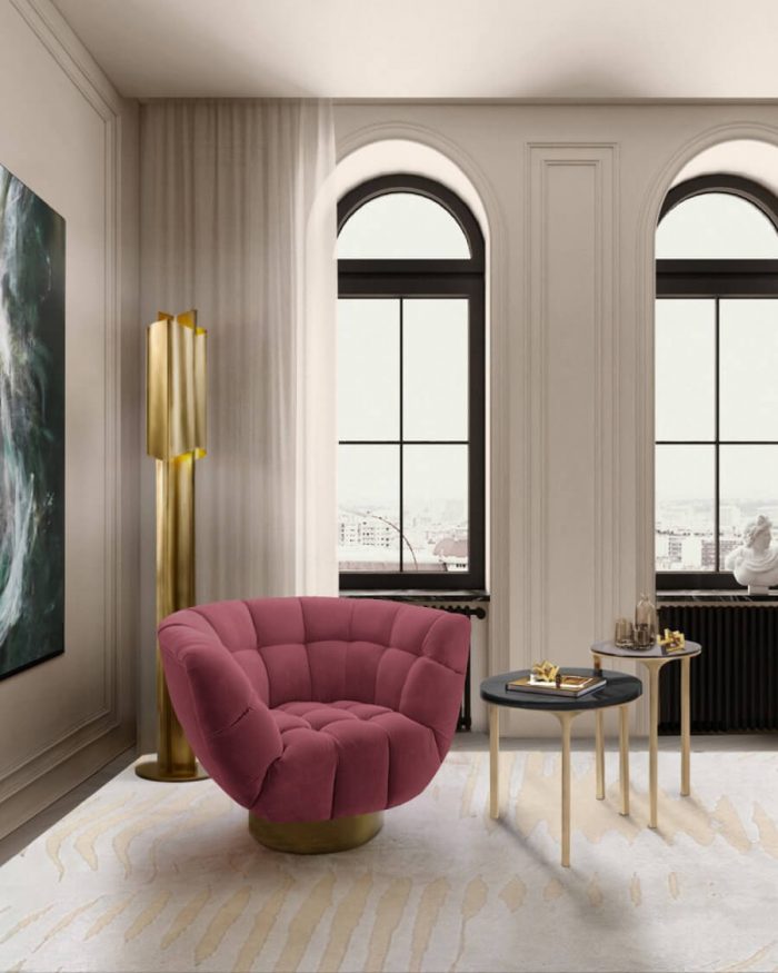Reading area space in a master bedroom with a luxury pink armchair. The metamorphosis was the inspiration of the ESSEX Swivel Chair by Brabbu. This barrel chair is upholstered in velvet and has a base in brushed aged brass matte that adds charisma. It will add refined elegance to any living room set that only velvet chairs are capable of.