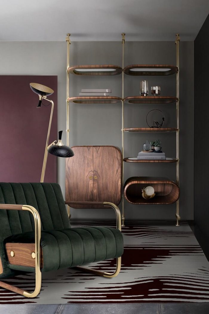 Luxury reading area with dark walls and elegant furniture pieces. In this ambiance, the Imperfectio Armchair, by Boca do Lobo, is the expression of imperfect aesthetic, the appeal of that which is authentic art that is truer to life.