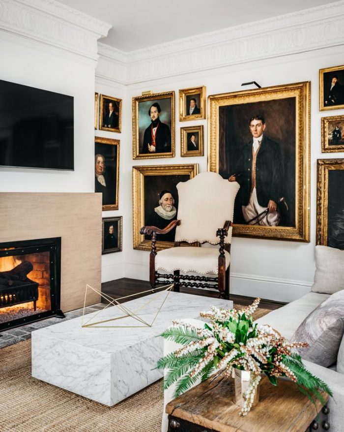 Let us begin the walk-around in this place through the living room. Embellished with 17th, 18th, and 19th centuries’ portraits, there’s a custom sofa upholstered in a Glant linen, a cocktail table is by Restoration Hardware.