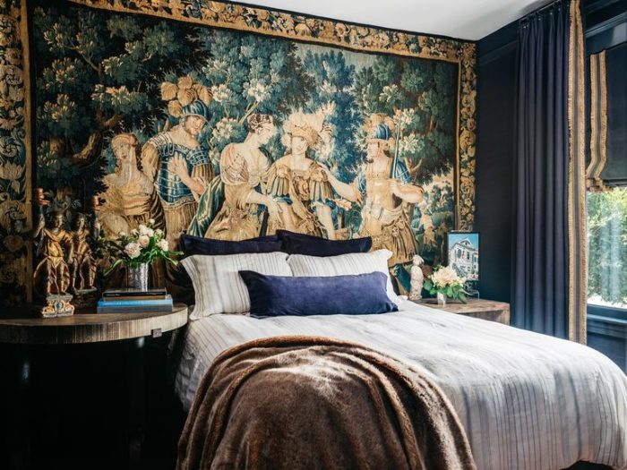 In the main bedroom, the bedding is by Restoration Hardware, and the tapestry is the 17th-century from Brussels. The left side table is an industrial potting table, topped with a pair of 17th-century Italian figural candle holders and a silver vase by Luiz Ferreira.